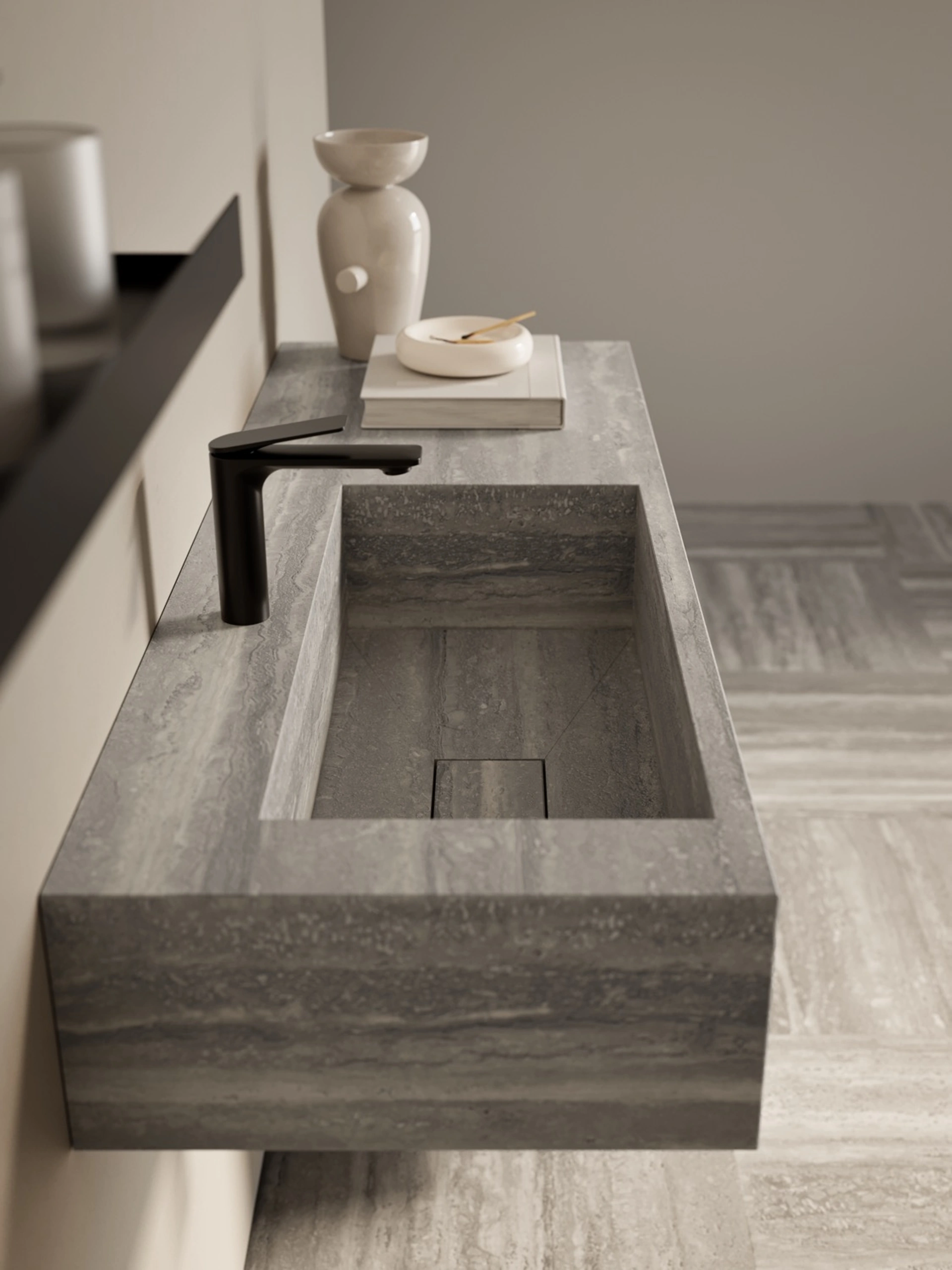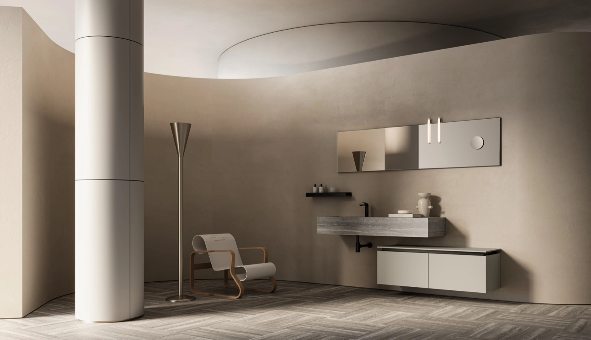mobili bagno sospesi in polimerico della firma Puntotre: clicca e scopri l'arredo bagno moderno Alto 02 per la stanza del benessere.