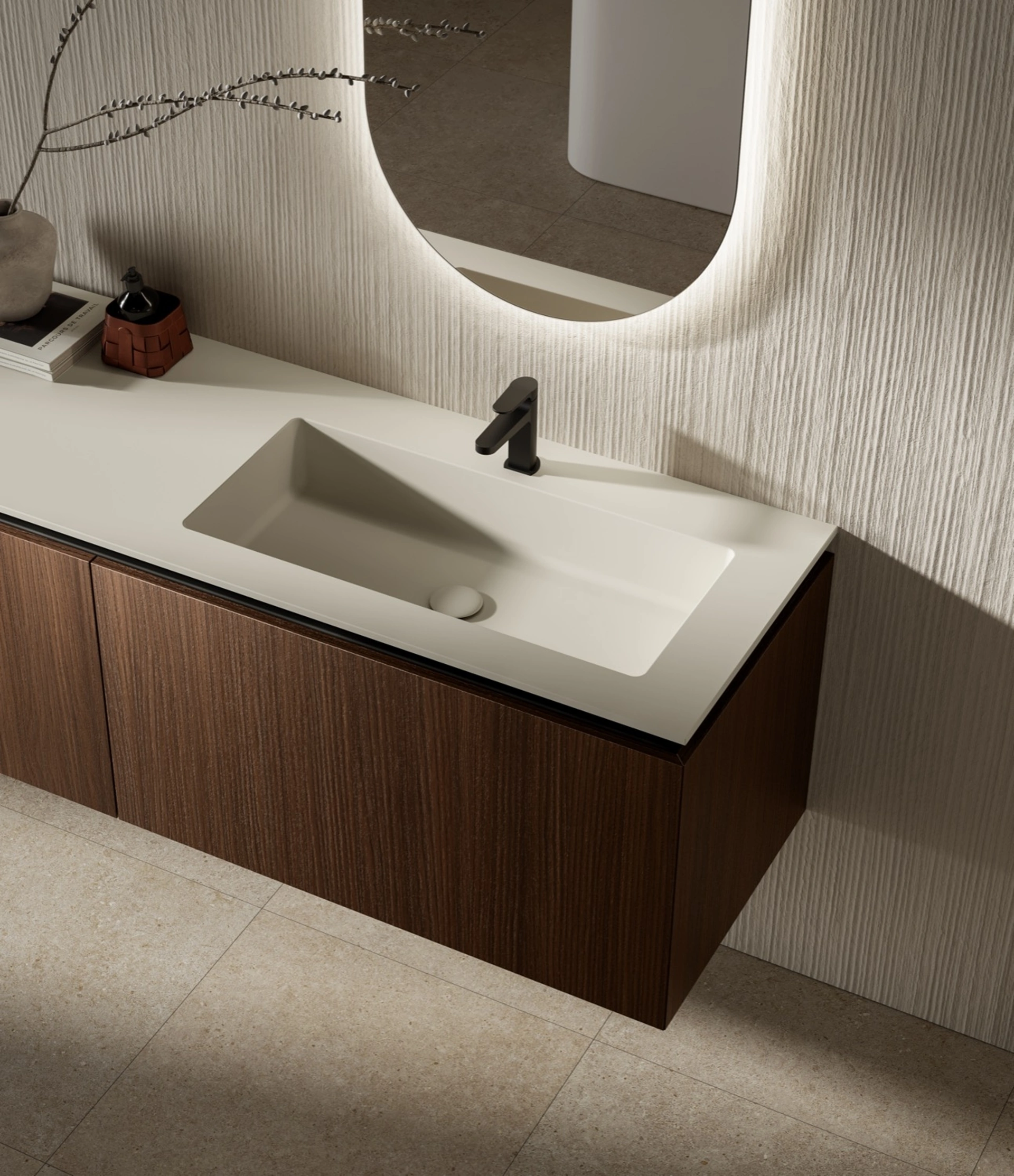 Arreda la stanza del benessere moderno alla perfezione con Alto 11, mobili bagno sospesi e complementi in laminato di Puntotre.