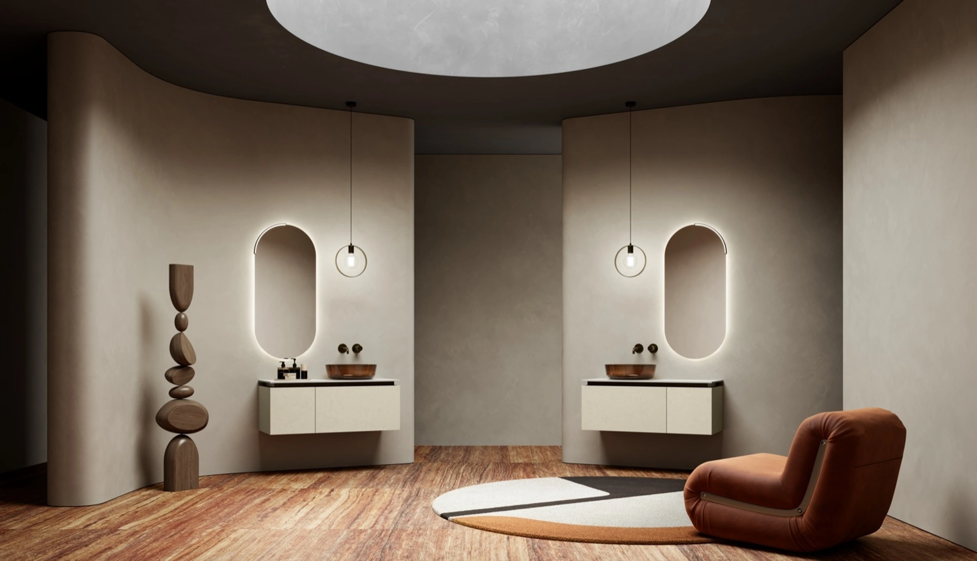 mobili bagno sospesi in laminato del marchio Puntotre: clicca e scopri l'arredo bagno moderno Alto 12 per la stanza del benessere.