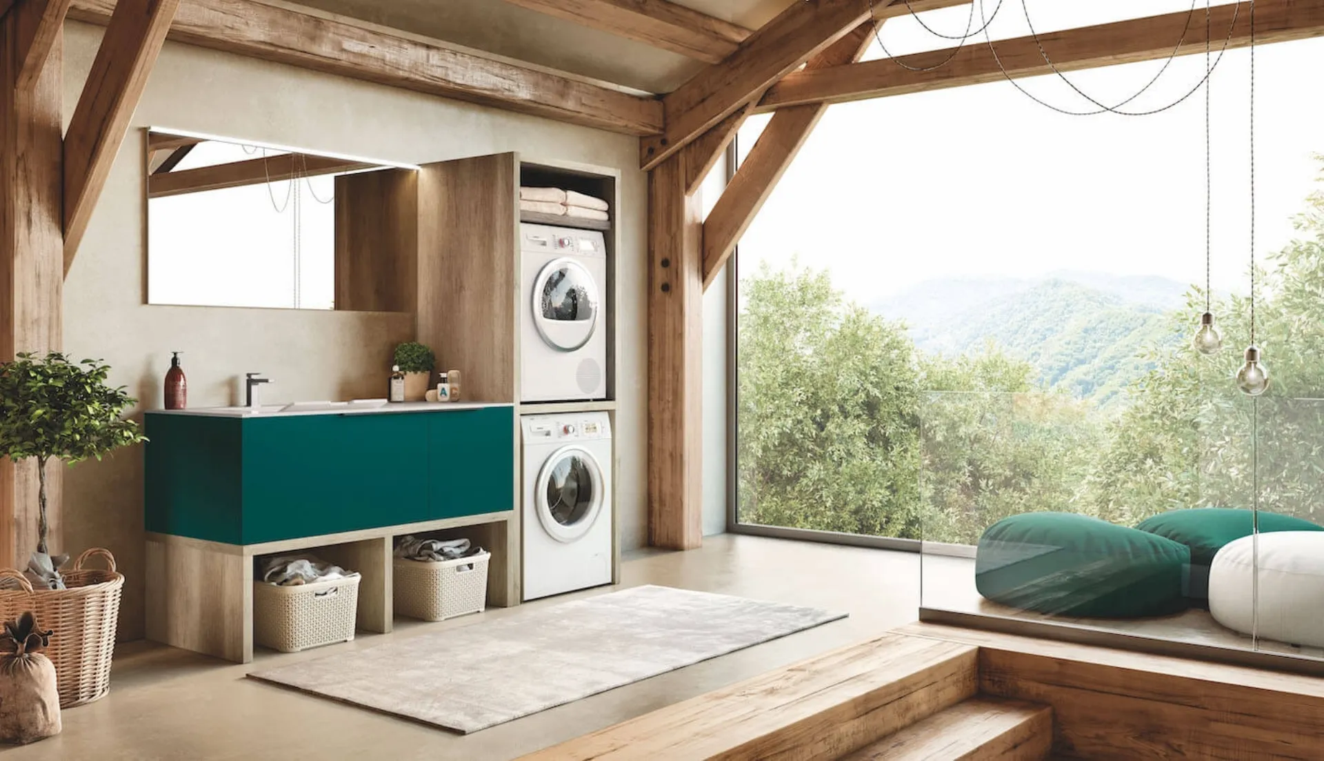 Arreda il bagno di casa moderno alla perfezione con Laundry 08, mobili bagno per lavanderia e complementi in laccato opaco di Puntotre.